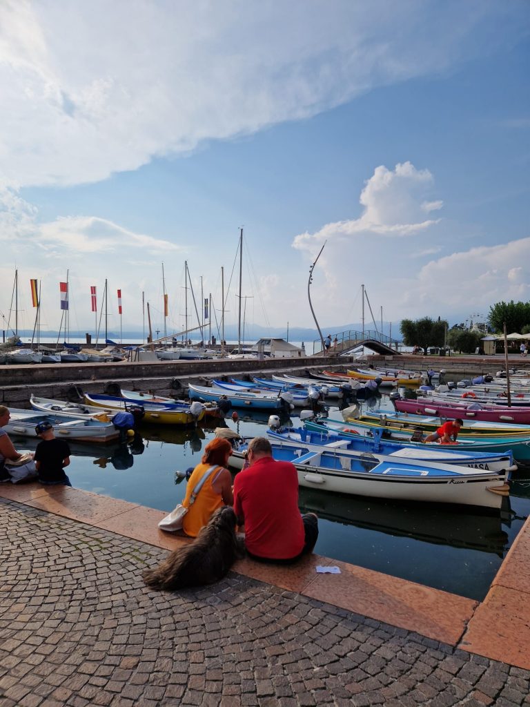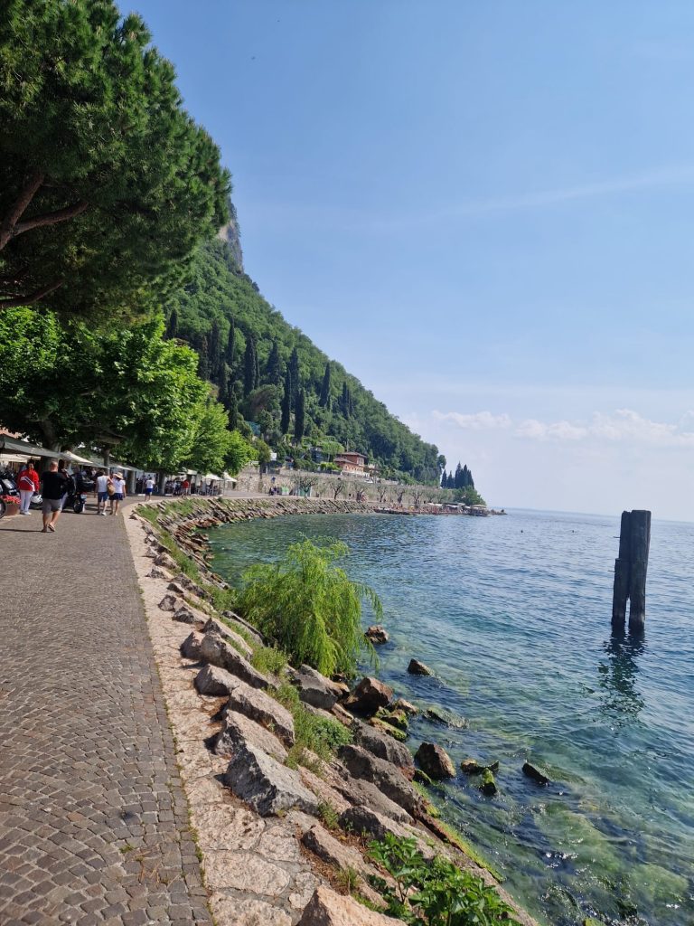 Plaja este cu pietricele, dar după mine contează mai puțin ce este pe jos când te afli într-un loc paradisiac, precum Lacul Garda. Există plaje amenajate cu sezlong ori plaje publice, unde poti să stai pe ce vrei tu 😊. Dacă ai un patruped, pe care nu ai unde să-l lași îl poți lua linistită cu tine la plaja, aici este acceptat, iar daca îți inchiriezi un sezlong și umbrelă, are și el parte de sezlongul lui gratis 😊.